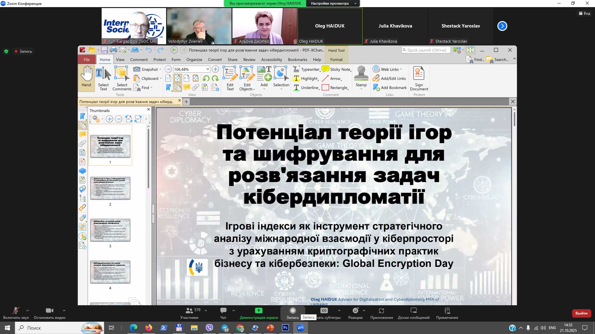 • Гайдук О. В., дипломатичний радник МЗС України з цифровізації та кібердипломатії, автор першого в Україні університетського курсу з кібердипломатії в своєї доповіді висвітлив комплексне питання кібердипломатії у поєднанні з питаннями штучного інтелекту та кібербезпеки